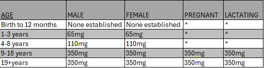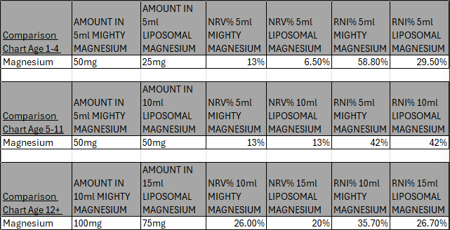 For clarity, the tables below outline the magnesium provided in Mighty Kids products by age group, compared with NRV and RNI values, as well as a table showing the official safe upper limits for supplemental magnesium set by the NIH: